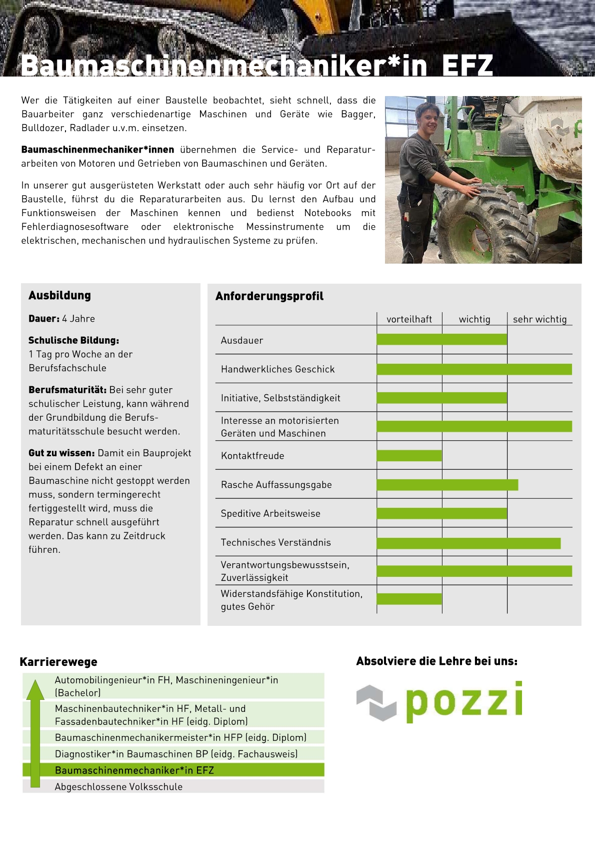 Ich habe mich für eine Lehre bei Pozzi entschieden, weil ich die Arbeit sehr interessant und abwechslungsreich fand. Zudem hat mich das kleine und motivierte Team in der Werkstatt sehr begeistert. Die Arbeit war vom ersten Tag an sehr abwechslungsreich, da die Firma über einen grossen und vielfältigen Fuhrpark verfügt.