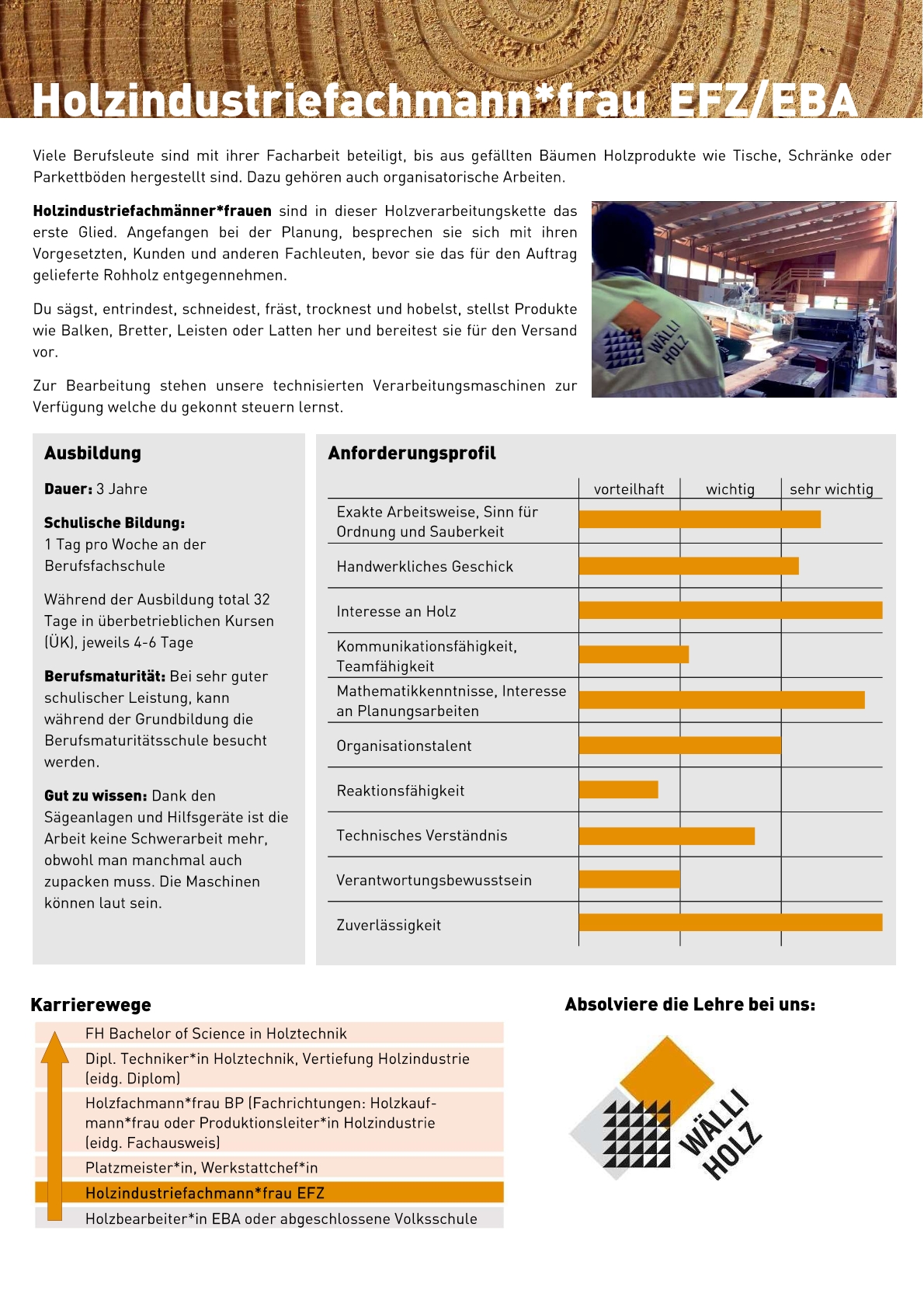 Viele Berufsleute sind mit ihrer Facharbeit beteiligt, bis aus gefällten Bäumen Holzprodukte wie Tische, Schränke oder Parkettböden hergestellt sind. Dazu gehören auch organisatorische Arbeiten.
