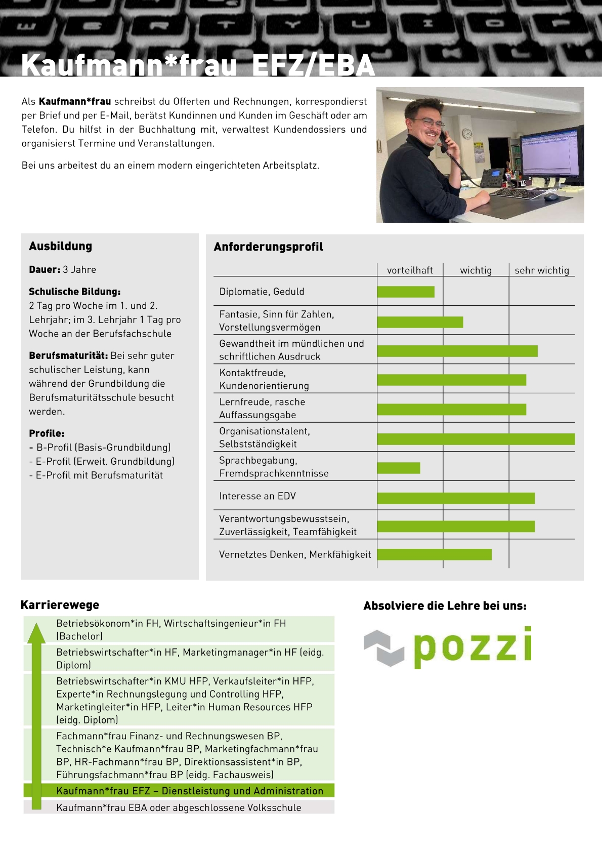 Als Kaufmann*frau schreibst du Offerten und Rechnungen, korrespondierst per Brief und per E-Mail, berätst Kundinnen und Kunden im Geschäft oder am Telefon. Du hilfst in der Buchhaltung mit, verwaltest Kundendossiers und organisierst Termine und Veranstaltungen.
