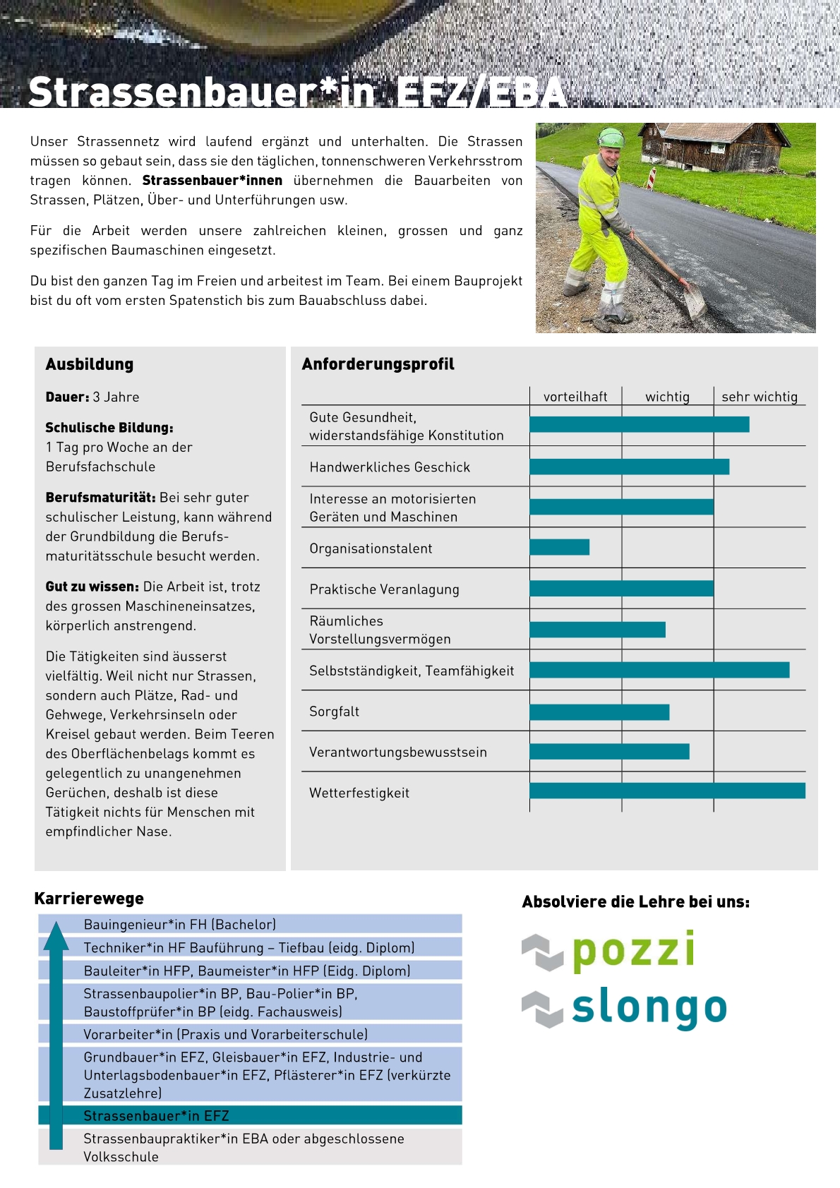 Unser Strassennetz wird laufend ergänzt und unterhalten. Die Strassen müssen so gebaut sein, dass sie den täglichen, tonnenschweren Verkehrsstrom tragen können. Strassenbauer*innen übernehmen die Bauarbeiten von Strassen, Plätzen, Über- und Unterführungen usw.