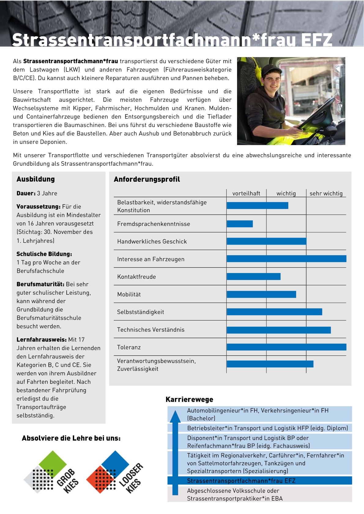 Die grosse Transportflotte mit den verschiedenen Aufliegern hat mich sehr beeindruckt. Während der Schnupperlehre wurden mir die vielfältigen Tätigkeiten als Strassentransportfachmann gezeigt. Die verschiedenen Arbeiten haben mir sehr gut gefallen, deshalb habe ich mich für eine Lehre bei der Grob Kies AG entschieden.